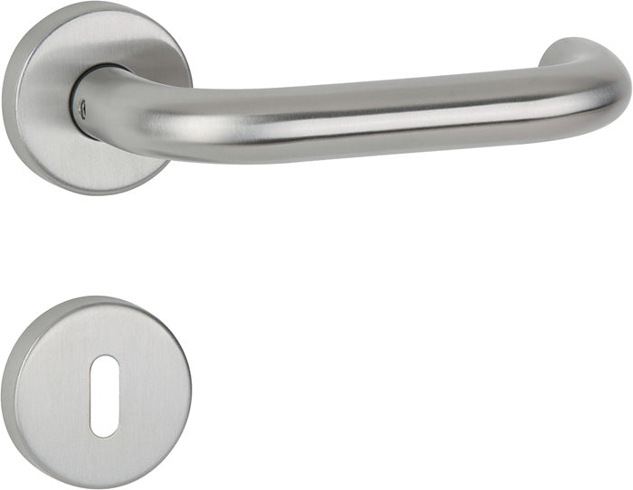 Matt stainless steel - 8 mm square spindle - tested to EN 1906 class 3 - suitable for DIN left / right - lever handle loosely mounted in plastic substructure - easy-to-install rosette system thanks to intelligent pre-assembly of clip rosettes and lever handle pins - double-sided hold-open spring, can be used on the right and left - separate installation of rosettes and lever handle pairs - suitable for door thickness 38-45 mm