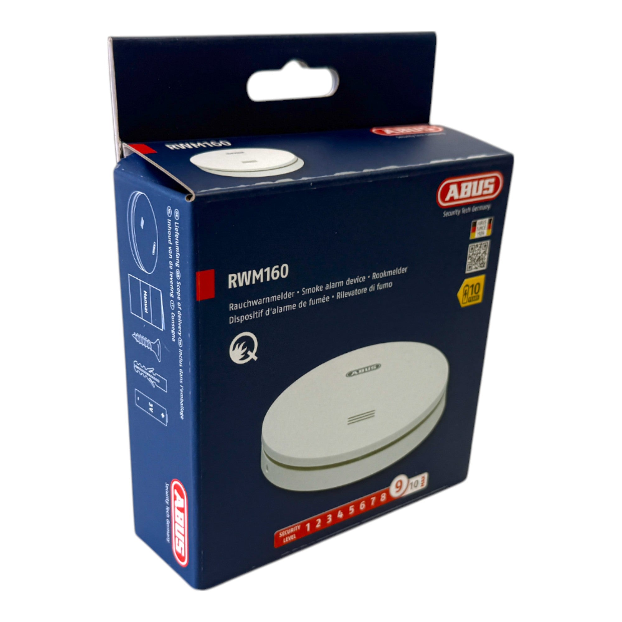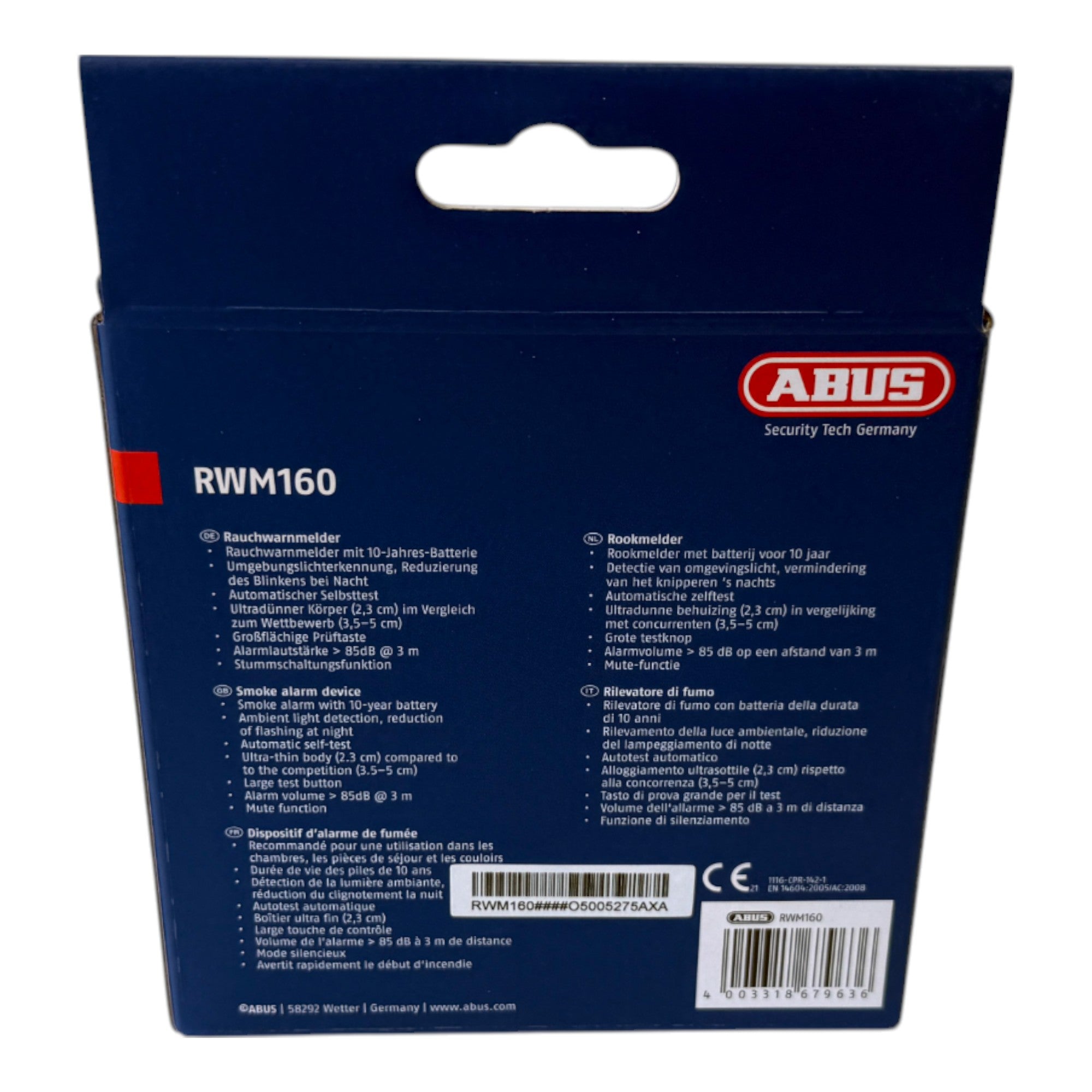 Il rilevatore di fumo ABUS RWM160 protegge tutto ciò che vi sta a cuore, dalla vostra casa ai porcellini d'India, e convince per l'affidabilità della tecnologia e la semplicità d'uso: il rilevatore ottico rileva il fumo in una fase precoce grazie a una camera di misurazione sensibile e vi avverte con un allarme sonoro di 85 dB. La batteria al litio installata in modo permanente dura fino a dieci anni, rendendo superflua la sostituzione periodica della batteria. Un segnale acustico informa tempestivamente quando la batteria si sta scaricando. Il controllo mensile delle funzioni è particolarmente semplice grazie all'ampio pulsante di prova, facilmente accessibile con il manico della scopa, anche in stanze alte. L'RWM160 offre anche una funzione di silenziamento, un autotest automatico e un'intelligente funzione di rilevamento della luce ambientale che riduce il lampeggiamento notturno. Con un'area di rilevamento fino a 40 m², un design compatto e ultrapiatto (Ø 115 mm, altezza 23 mm) e la certificazione di qualità in conformità a Q (vfdb 14/01) e DIN EN 14604, questo rilevatore di fumo è una soluzione di sicurezza affidabile ed elegante per la vostra casa.