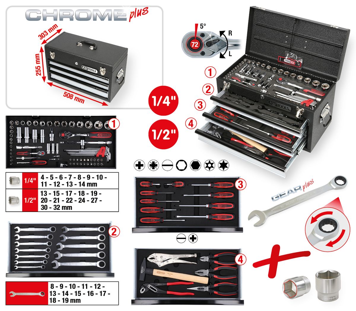 KS TOOLS 1/4+1/2 CHROMEplus Set di utensili universali, 99 pezzi GEAR ( 918.0100 )