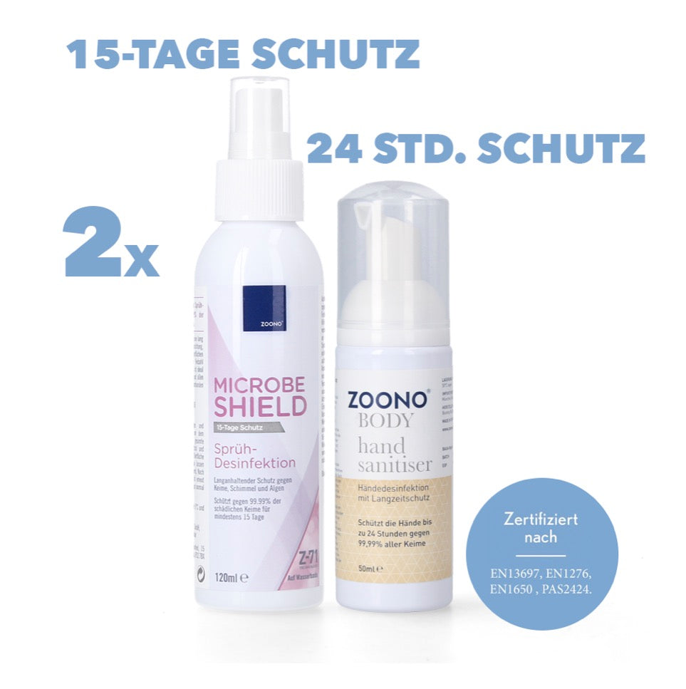 Zoono Kit di disinfettanti per superfici Z-71 Micobe Shield 120 ml - 2x pezzi+ 2x Disinfettanti per mani 50 ml (certificati in conformità a PAS 2424 / EN13697 / EN1276 / EN1650)