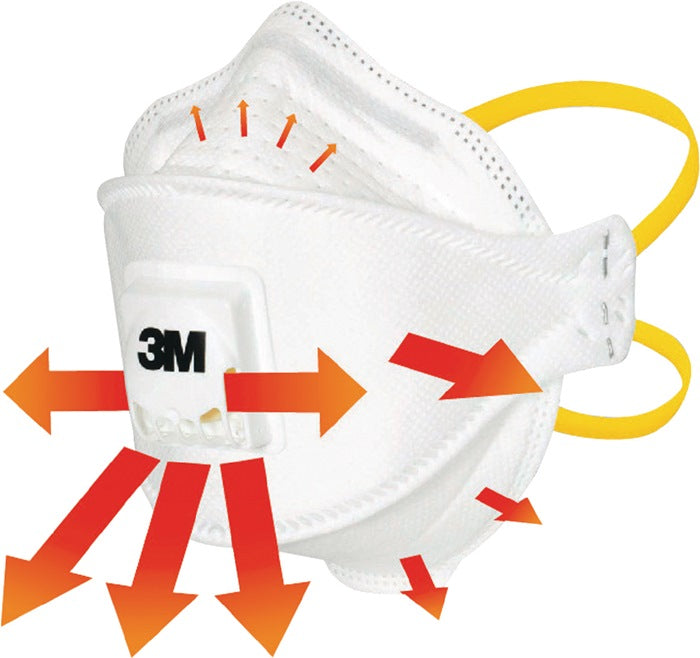 flaches 3-teiliges Design · faltbar · mit Ausatmungsventil · hoher Tragekomfort · vereinfachte Lagerung und Transport in hygienischer Einzelverpackung · gegen lungengängigen Feinstaub zugelassen bis zum 30-fachen des Grenzwertes für Schutzstufe FFP3 · Filterklasse: EN 149:2001 + A1:2009 FFP3 / V NRD · Anwendung: besonders geeignet in Arbeitsbereichen, die warm sind oder eine hohe Luftfeuchtigkeit aufweisen, z. B. in der Holzbearbeitung, beim Schleifen von Stein und Metall und im Umgang mit Glas- und Mineralfasern Masken der Serie 9300 mit Cool-Flow-Ausatemventil – für mehr Komfort. Das patentierte Cool-Flow-Ausatemventil sorgt für ein kühles Klima unter der Maske und verhindert einen Hitzestau.