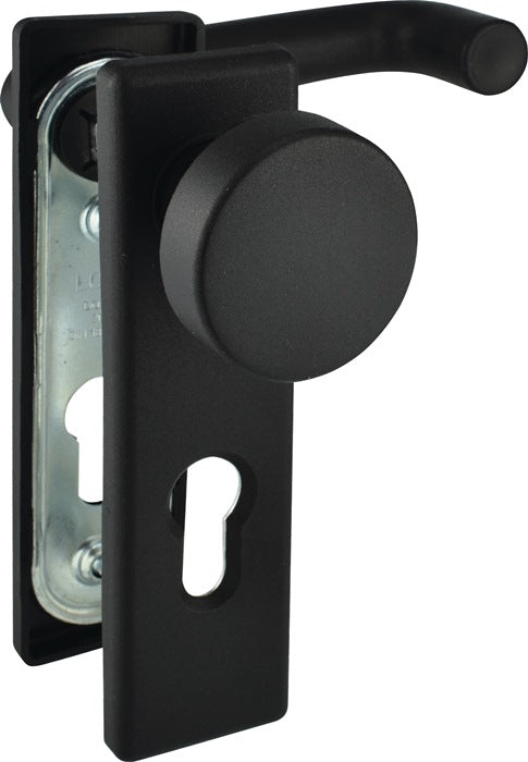 geprüft nach DIN 18273 · mit 2 Befestigungsschrauben · Lochung PZ · Entfernung 72 mm · Vierkant 9 mm · Drücker fest/drehbar gelagert · Schilder mit Stahl-Unterplatten und Kunststoffblenden · käntig· für Türstärke 40-66 mm · DIN links / rechts verwendbar · Farbe schwarz