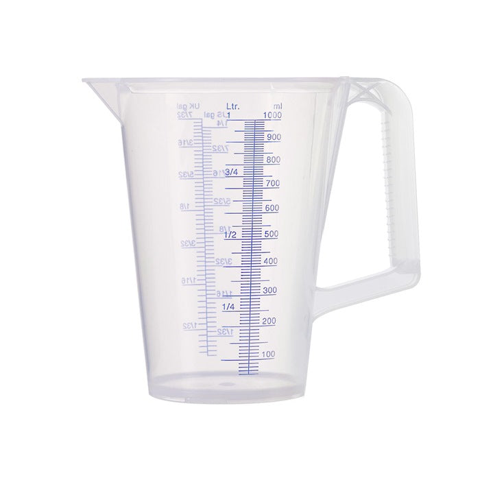 aus Polypropylen · auf jeder Messbecherseite eine erhabene, blau bedruckte Skala in MI und GAL · ergonomischer Handgriff mit Rillen für besseren Halt · beständig gegen neutrale Medien, Öle, Säuren und Alkohol · BPA-frei · lebensmitteltecht gem. (EU) Nr. 20/2011 und FDA § 21 CFR 177.1520