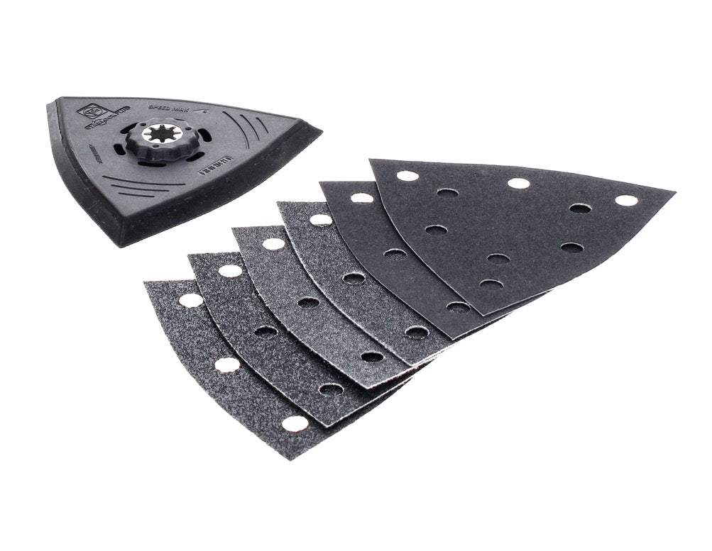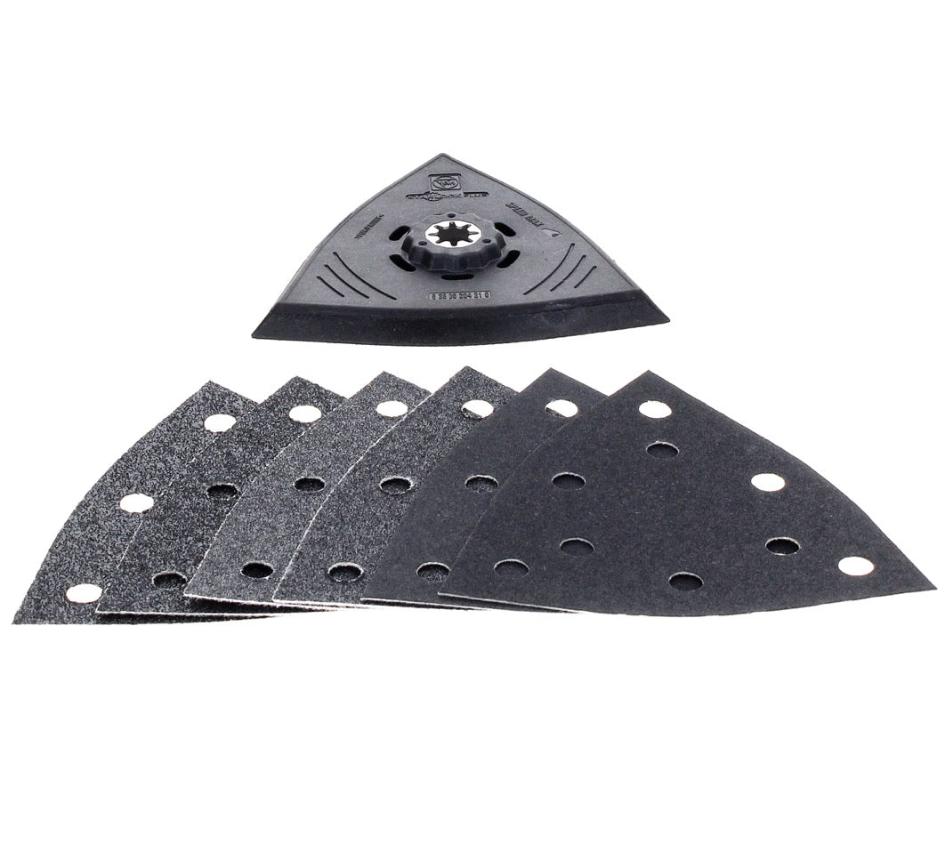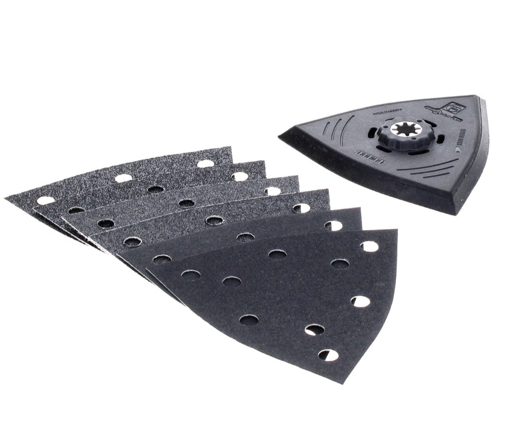 Das FEIN Schleifset enthält eine Dreiecks-Schleifplatte mit einer Kantenlänge von 130 mm und drei verschiedene Schleifblätter in jeweils doppelter Ausführung (K 60, K 80, K 180). Die Kunststoff-Trägerplatte dient zur Vermeidung von Beschädigungen und Markierungen auf dem Werkstück. Das Schleifset ist ideal einsetzbar zum wirtschaftlichen Schleifen von Rand- und Eckbereichen, sowie mittleren Flächen. Das Set verspricht keinen Rückschlageffekt an Kanten, sowie eine einfache Handhabung und sehr gute Abtragsleistung. Durch die Starlock Plus Aufnahme passt das Set an viele verschiedene Maschinen und lässt sich werkzeuglos montieren.