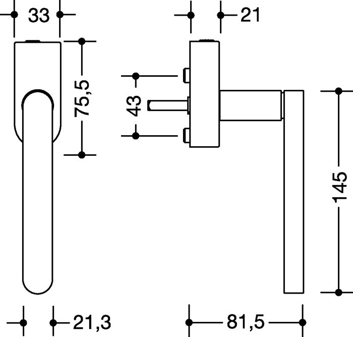 Acier inoxydable · diamètre d'épaule 21,3 mm · longueur 145 mm · avec tige carrée de 7 mm · rosace 75,5 x 33 mm · avec tige de support · avec cylindre de pression intégré avec 5 goupilles · surface de la poignée de fenêtre et de la rosace mate · lors de la commande , veuillez préciser la longueur exacte de la broche
