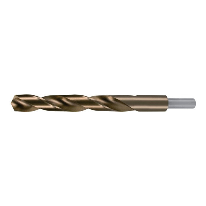 HSS-Co5 - DIN 338 - type N - angle de pointe 130 ° - rectifié au profil - coupe à droite - affûtage en croix selon DIN 1412 C - avec queue étagée - le foret hélicoïdal entièrement affûté dispose d'une précision de concentricité accrue - pour les aciers non alliés et alliés (résistance jusqu'à 1100 N/mm²), Aciers pour travail à chaud et à froid, aciers de traitement et de cémentation ainsi que pour les aciers résistants à la rouille et aux acides - Idéal pour le perçage de grands diamètres de trous pour toutes les perceuses courantes avec un mandrin de serrage jusqu'à 13,0 mm