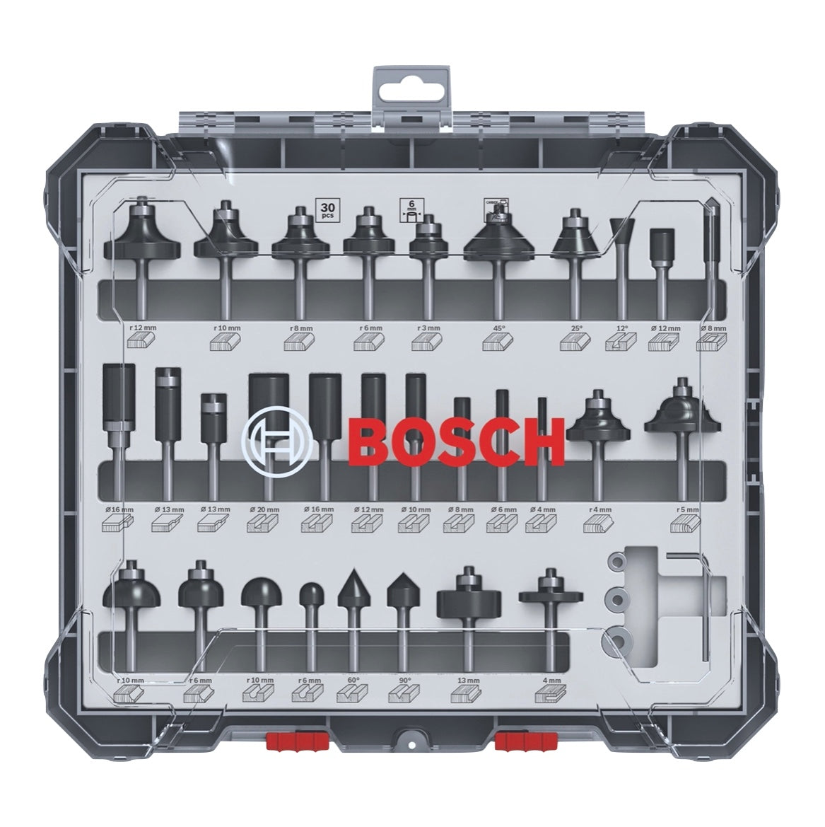 - 1x Jeu de fraises Bosch 30 pièces. Tige de 6 mm (2607017474) comprenant :