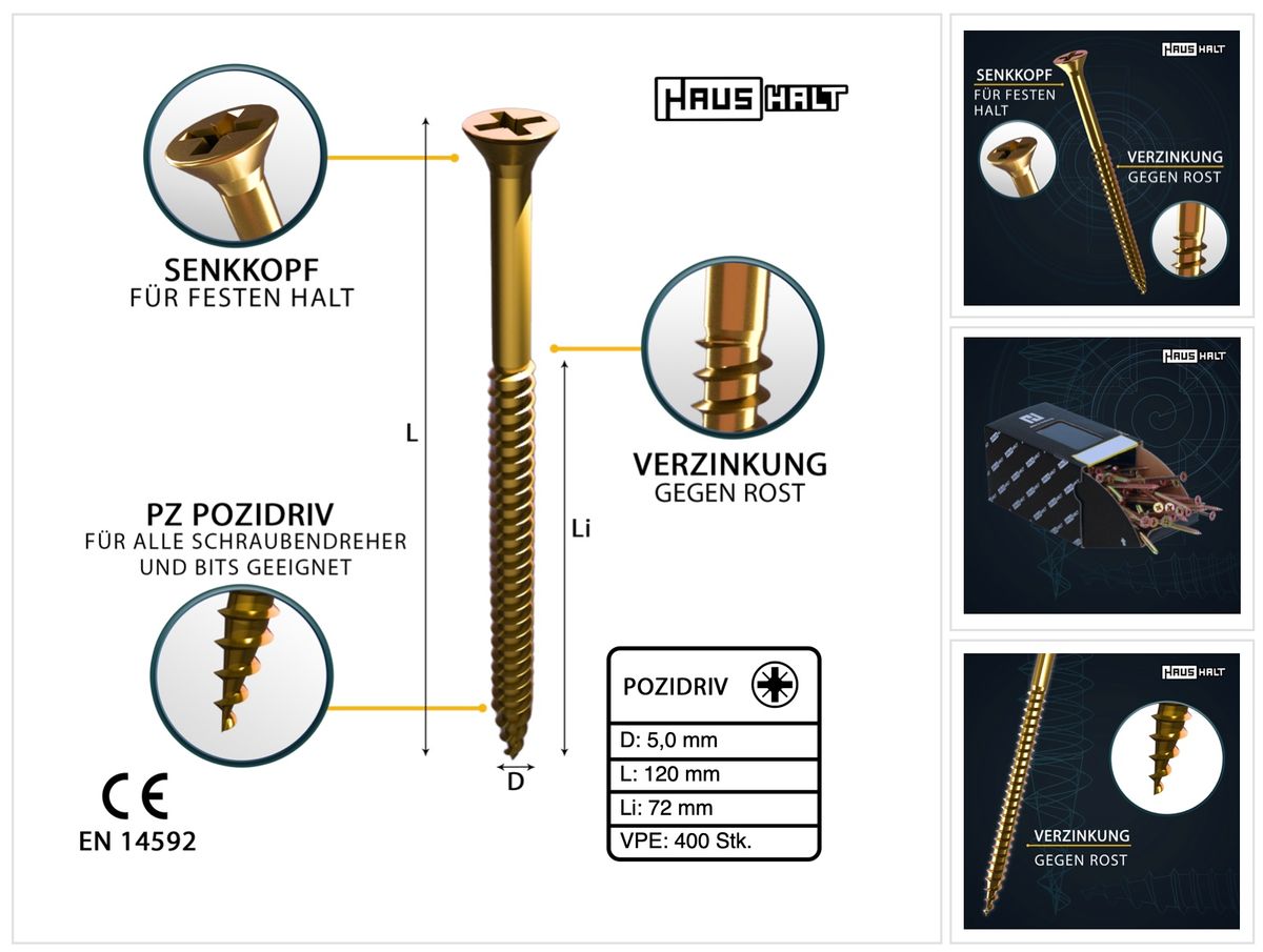 HausHalt Vite universale per legno 5,0x120mm - PZ2 - Zincato giallo - Pozidriv a croce - Testa svasata - Filettatura parziale - 400 pz. (4x 000051371186)