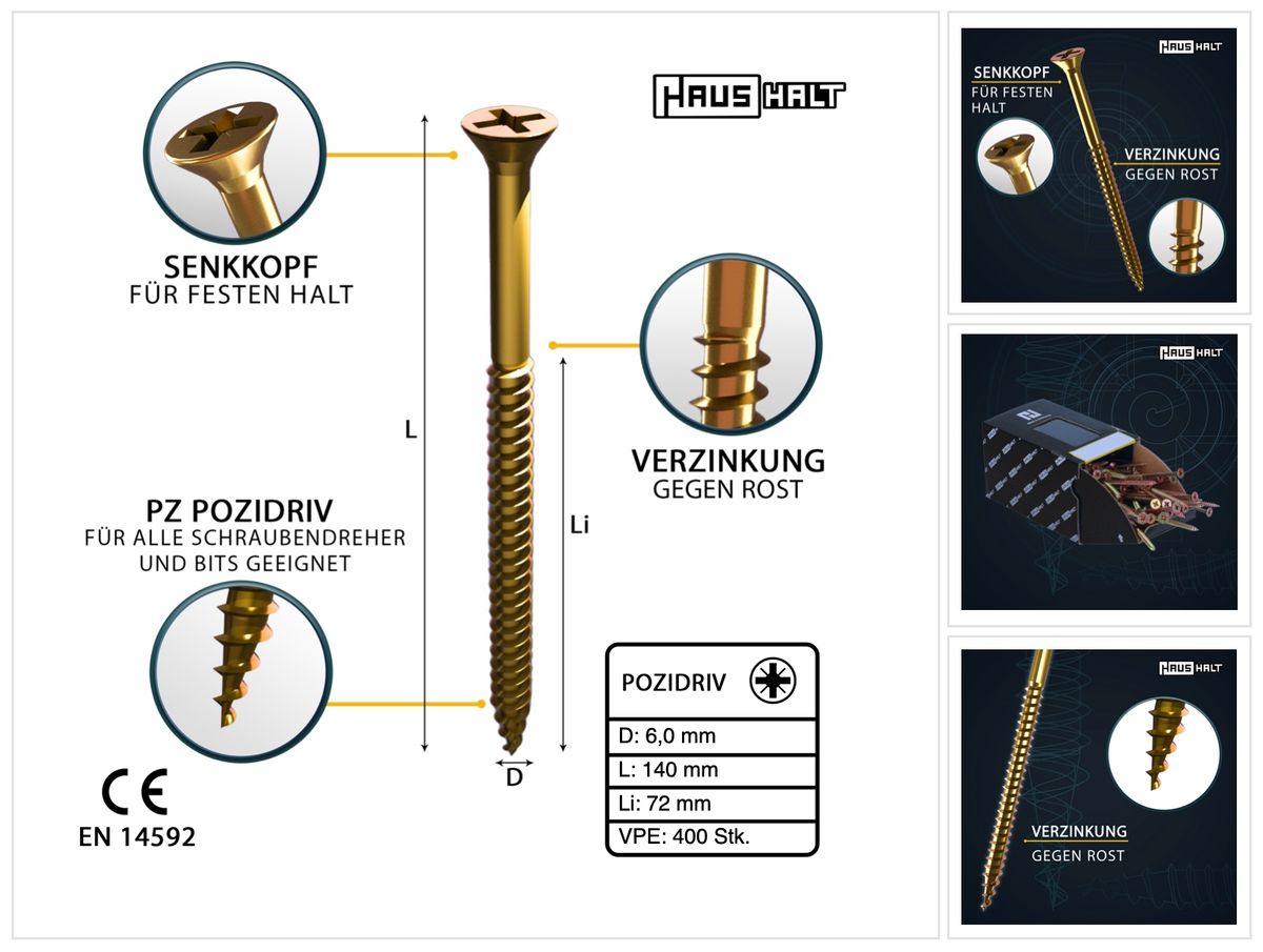 HausHalt Vite universale per legno 6,0x140mm - PZ3 - Zincato giallo - Pozidriv a croce - Testa svasata - Filettatura parziale - 400 pz. (4x 000051371217)