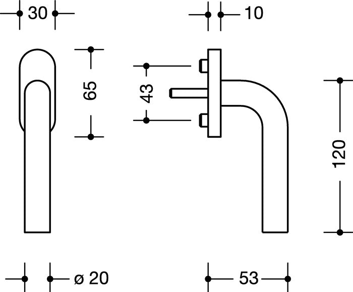 in poliammide, diametro 20 mm, lunghezza 120 mm, con punti di chiusura a 90 gradi e perno pieno da 7 mm, lunghezza 30 mm sporgente. Preassemblato su rosetta ovale 65 x 33 mm, con perno di supporto diametro 10 mm, connessione a vite nascosta, distanza tra i fori delle viti 43 mm, cappuccio di copertura in poliammide. Fornito senza viti di fissaggio - Articolo: HEWI 111FG.6