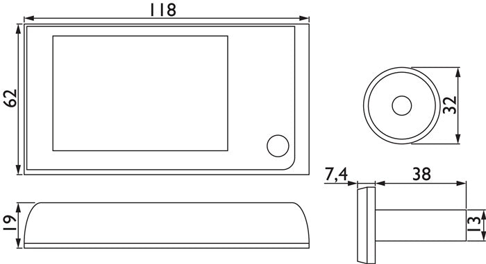 schermo a colori da 3,5″ - telecamera da 1,0 megapixel - dimensioni esterne: 119 x 63 x 19 mm - installazione rapida e semplice per il foro standard della porta da 14 a 28 mm - non sono necessari altri fori sulla porta - installazione e rimozione successive possibili in qualsiasi momento - dopo l'attivazione dello schermo, si spegne automaticamente dopo 15 secondi - adatto per porte di spessore 38-116 mm - temperatura di funzionamento da -10° a +50° Celsius - angolo di visione 120° - 4 batterie AAA (non incluse)