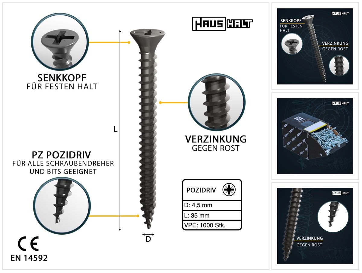 - 1000x HausHalt Universal Holzbauschraube Holzschraube 4,5 x 35 mm PZ2