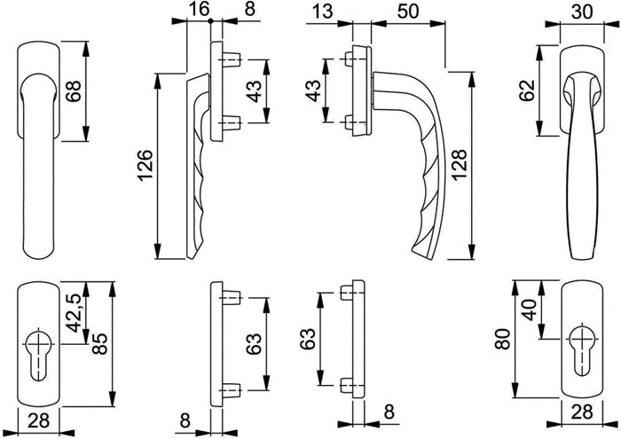 Rosetten-Garnitur · Außengriff mit kurzem Hals fest verstiftet · inkl. drei Schraubensets zur Überbrückung von unterschiedlichen Türdicken · verdeckte Verschraubung · Vierkant 7 mm
