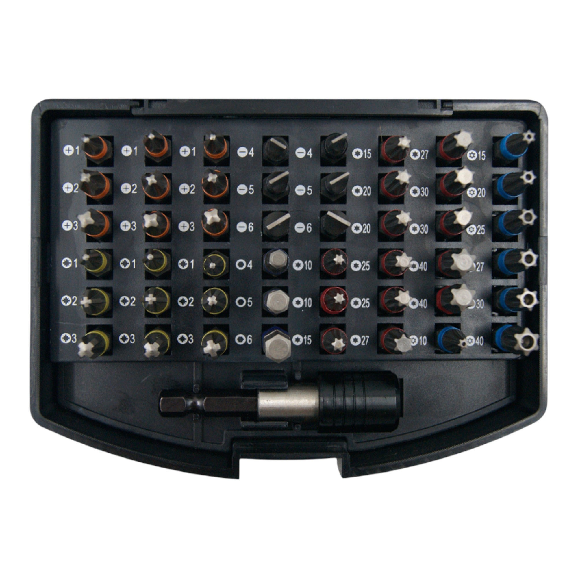 - 48x 25 mm Bit ( 3x PH1 / 3x PH2 / 3x PH3 / 3x PZ1 / 3x PZ2 / 3x PZ3 / 2x SL4 / 2x SL5 / 2x SL6 / H4 / H5 / H6 / 2x T10 / 2x T15 / 2x T20 / 2x T25 / 2x T27 / 2x TT30 / 2x TT40 / TT10 / TT15 / TT20 / TT25 / TT27 /  TT30 / TT40 )
